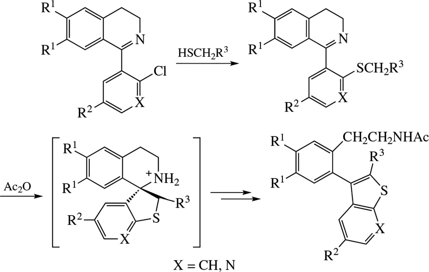 A new recyclization of 3,4-dihydroisoquinolines is a convenient route to derivatives of new bbb-(o-benzothienylaryl)-and bbb-(o-thieno[2,3-b]pyridinylaryl)-containing ethylamines. These compounds look promising monoaminergic agents.