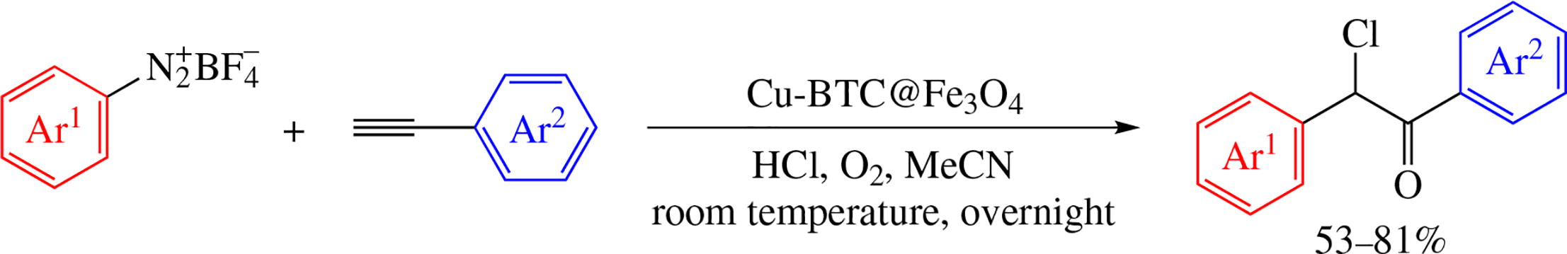 Metal–organic framework (MOF) composite, viz. Cu-BTC@Fe3O4 (BTC is 1,3,5-benzenetricarboxylate), was prepared and utilized for the synthesis of aryl α-chlorobenzyl ketones from arenediazonium salts and arylacetylenes in moderate to good yields. This reaction proceeded via a radical domino process. The catalyst could be readily recovered with an external permanent magnet, with slight decrease in its activity after successive six runs.