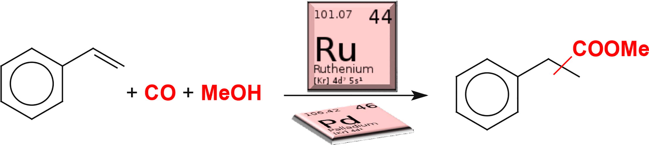 Methoxycarbonylation of styrene in the presence of homogeneous Ru catalysts is reported for the first time. Available Ru3(CO)12 together with halide source such as [bmim]Br, NaBr or LiCl represents active and easy to handle methoxycarbonylation catalyst. The key advantage of the new catalytic systems over traditional Pd catalysts is their high activity at CO pressure as low as 5 bar.