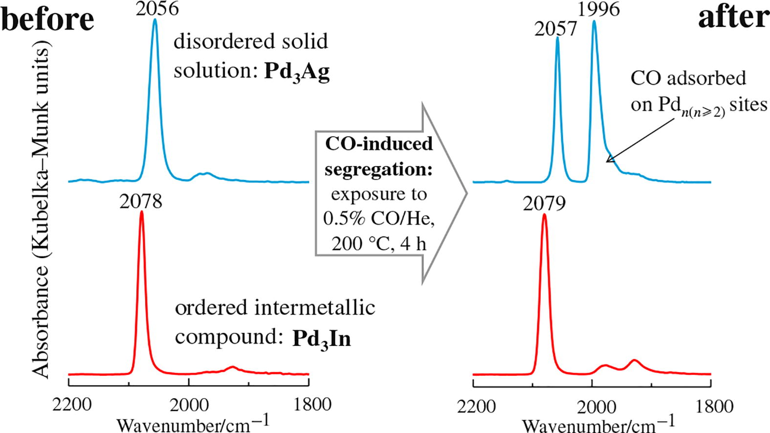 In the course of the treatment of Pd3Ag/α-Al2O3 in 0.5%CO + He at 200 °C, intense transformation of single atom Pd1 surface sites isolated from each other by Ag atoms to multiatomic Pdn (n ≥ 2) ensembles occurs, as revealed by a rapid increase in the intensity of multibonded CO bands in FTIR spectra. The structure of intermetallic Pd3In nanoparticles is significantly more stable, and the formation of new multiatomic adsorption centers was not observed even after extended CO exposures.