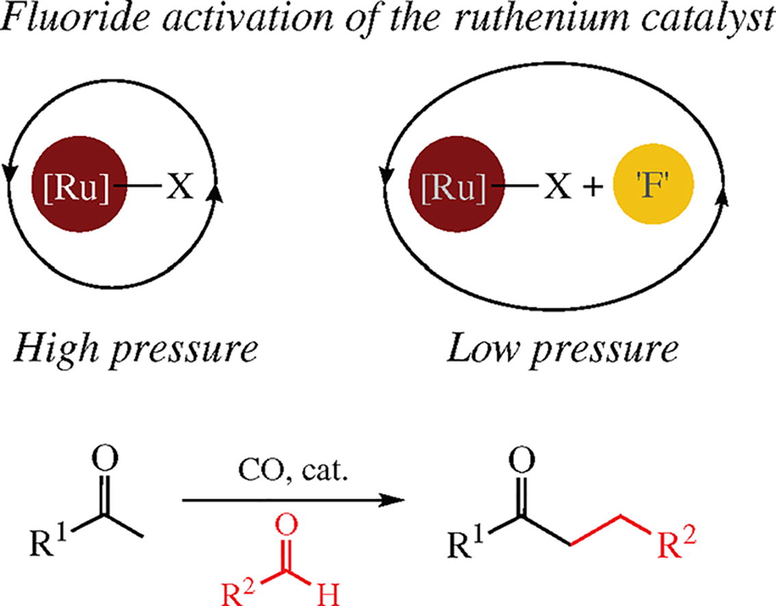 Fluoride additive to [(p-cymene)RuCl2]2, a readily available ruthenium catalyst, allows one to achieve milder conditions for the reductive alkylation of aldehydes with ketones using carbon monoxide as a reducing agent. The procedure is suitable for the broad substrate scope, and a probable explanation for the fluoride role was provided.