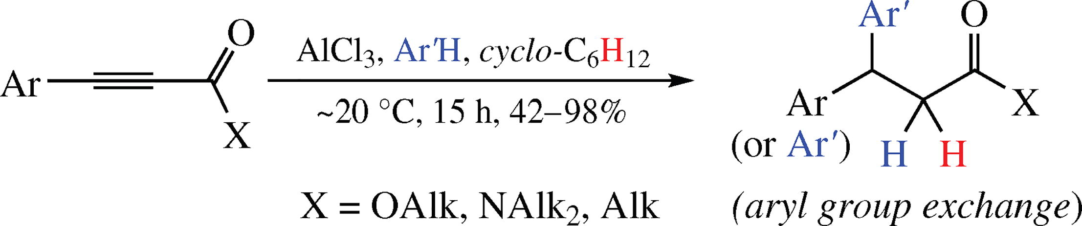 Reactions of 3-arylpropynoic acid derivatives and conjugated acetylene ketones with arenes and cyclohexane under the action of AlCl3 at room temperature for 15 h afford the corresponding products of one-pot tandem hydroarylation-ionic hydrogenation of the acetylene bond of the starting compounds in 42-98% yields. This reaction is accompanied by aryl group exchange process under acidic conditions.