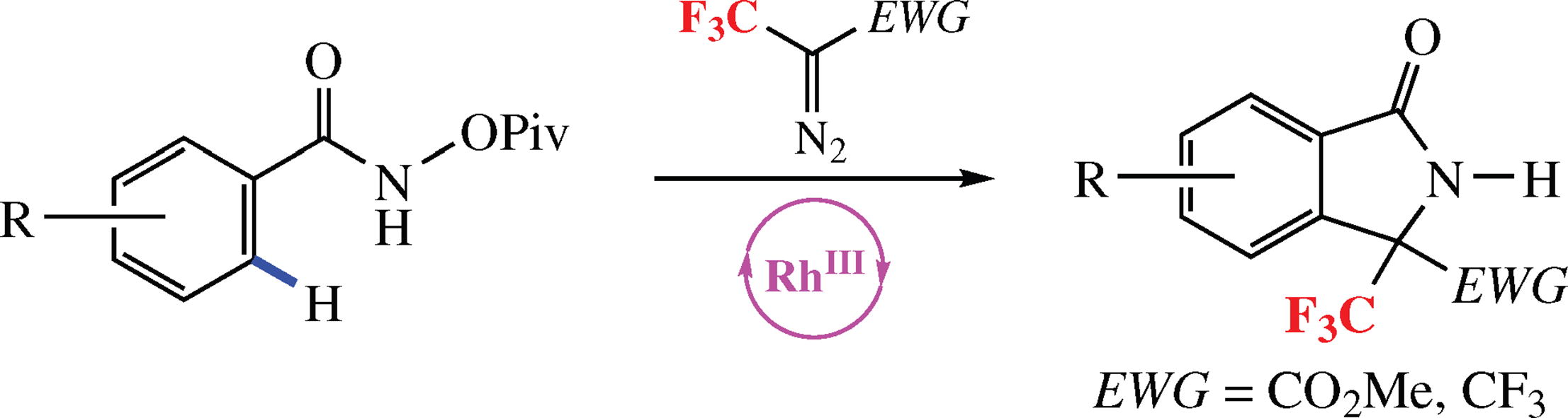 An efficient method for the selective preparation of trifluoro-methyl-substituted isoindolones has been developed via RhIII catalyzed C-H activation / [4 + 1]-annulation of aryl hydroxamates with functionalized acceptor/acceptor diazo compounds as cross-coupling partners.