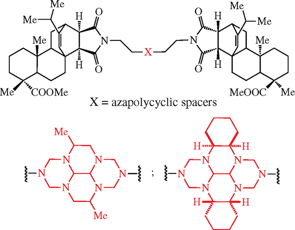 Novel terpenoid dimers linked through the E-E rings were synthesized by catalytic multicomponent condensation of amino derivatives of methyl maleopimarate with form-aldehyde and dimethyl-tetraazadecalin or tetraazaperhydro- tetracene. Primary screening of the synthesized terpenoid dimers for cytotoxic activity was performed.