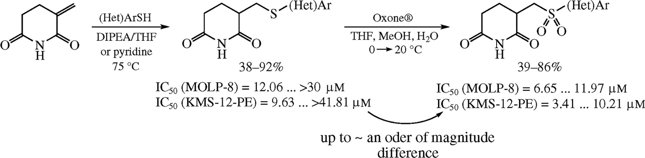 2-Methylidenepiperidine-2,6-dione was employed as a substrate in the thio-Michael addition of a series of (hetero)-aromatic thiols. Oxidation of the resulting (hetero)arylthio derivatives with Oxone® gave the corresponding sulfones. Testing of the latter against multiple myeloma cell lines MOLP-8 and KMS-12-PE alongside with selected precursor sulfides confirmed the earlier observed significantly higher cytotoxicity of sulfones.