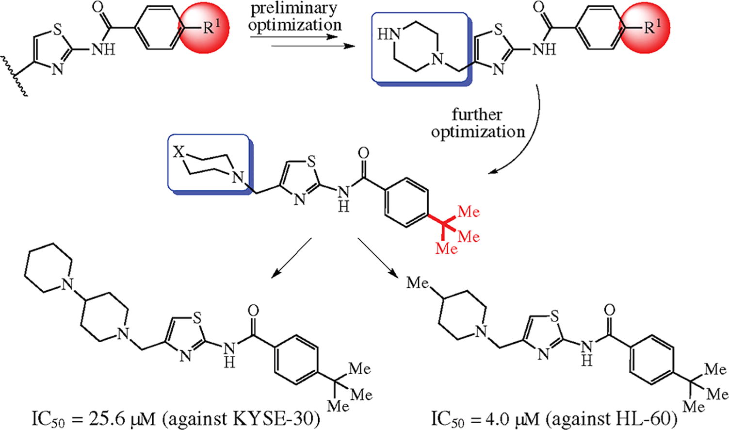 Novel 2-amino-4-(aminomethyl)thiazole derivatives were designed and synthesized by a facile method including the Hantzsch construction of thiazole core followed by amidation and nucleophilic substitution steps. Bioassay results showed that 4-(tert-butyl)-N-[4-(piperazin-1-ylmethyl)thiazol-2-yl]-benzamide and 4-(tert-butyl)-N-{4-[(4-piperidinopiperidin-1-yl)methyl]thiazol-2-yl}benzamide possessed similar activities compared with 5-fluorouracil. The 4-piperidino-piperidin-1-yl-containing derivative also suppressed proliferation of cultured tumor cells by inducing apoptosis.