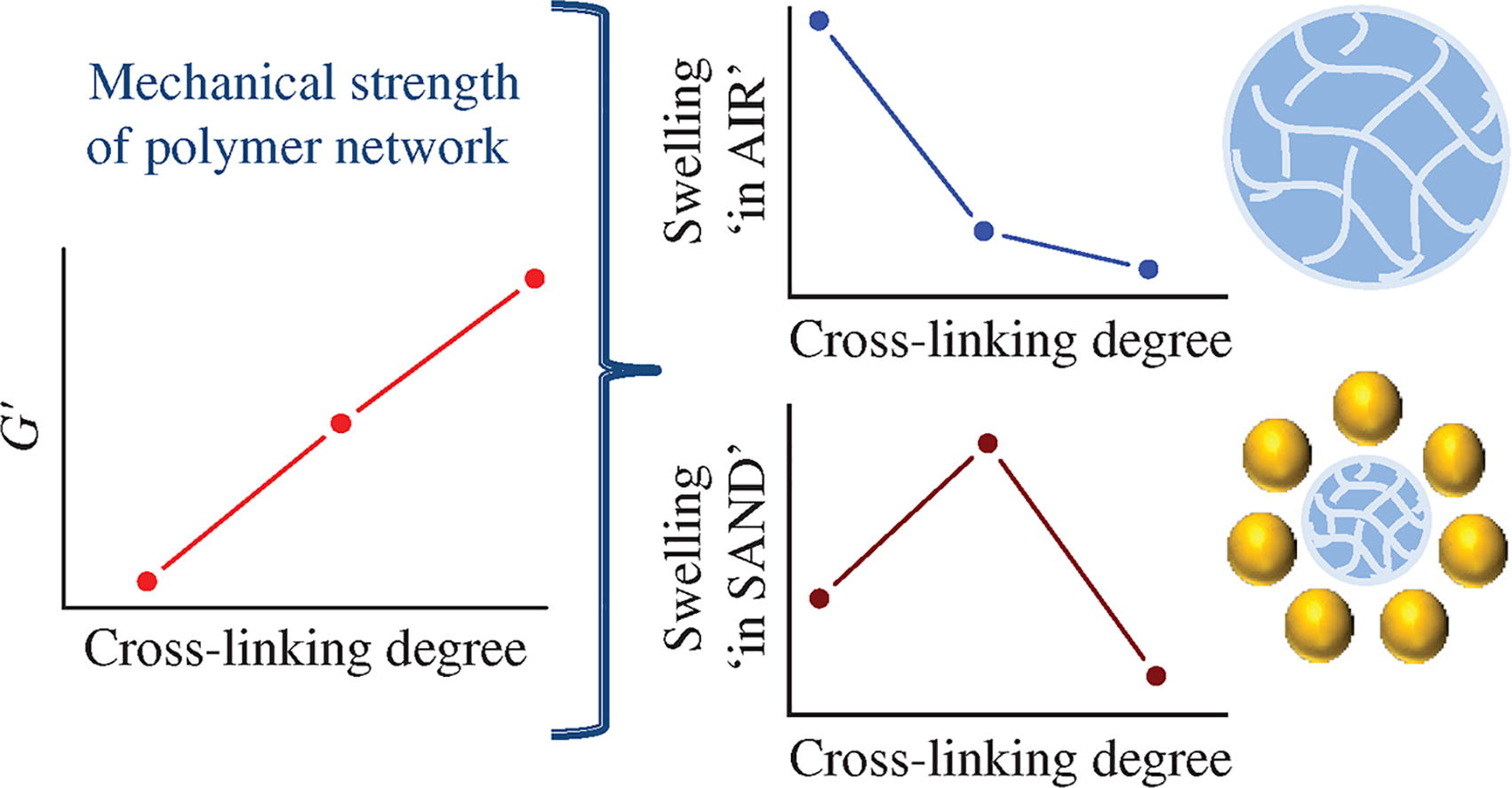 Cross-linked polymers consisting of acrylamide, sodium acrylate, starch fragments and a cross-linker were synthesized with the same content of carboxyl groups and three degrees of cross-linking Q of 0.04, 0.2 and 1 wt%. An increase in Q gradually reduces the swelling of polymer gels in water; when distributed in sand, polymer gels exhibit maximum swelling at Q = 0.2 wt%. It is shown that the behavior of polymer gels in sand is determined by the balance between the elasticity of swollen polymer gels and the resistance of sand particles