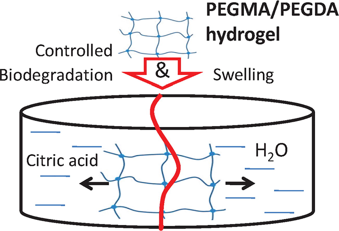 The ability of hydrogels based on acrylate derivatives of polyethylene glycol (PEG) with different ratios of monomers to swell and degrade, as well as their behavior during heating, have been explored. The possibility to control the swelling and degradation processes in the model medium by varying the ratio of PEG-methacrylate (PEGMA) and PEG-diacrylate (PEGDA) monomers was demonstrated.