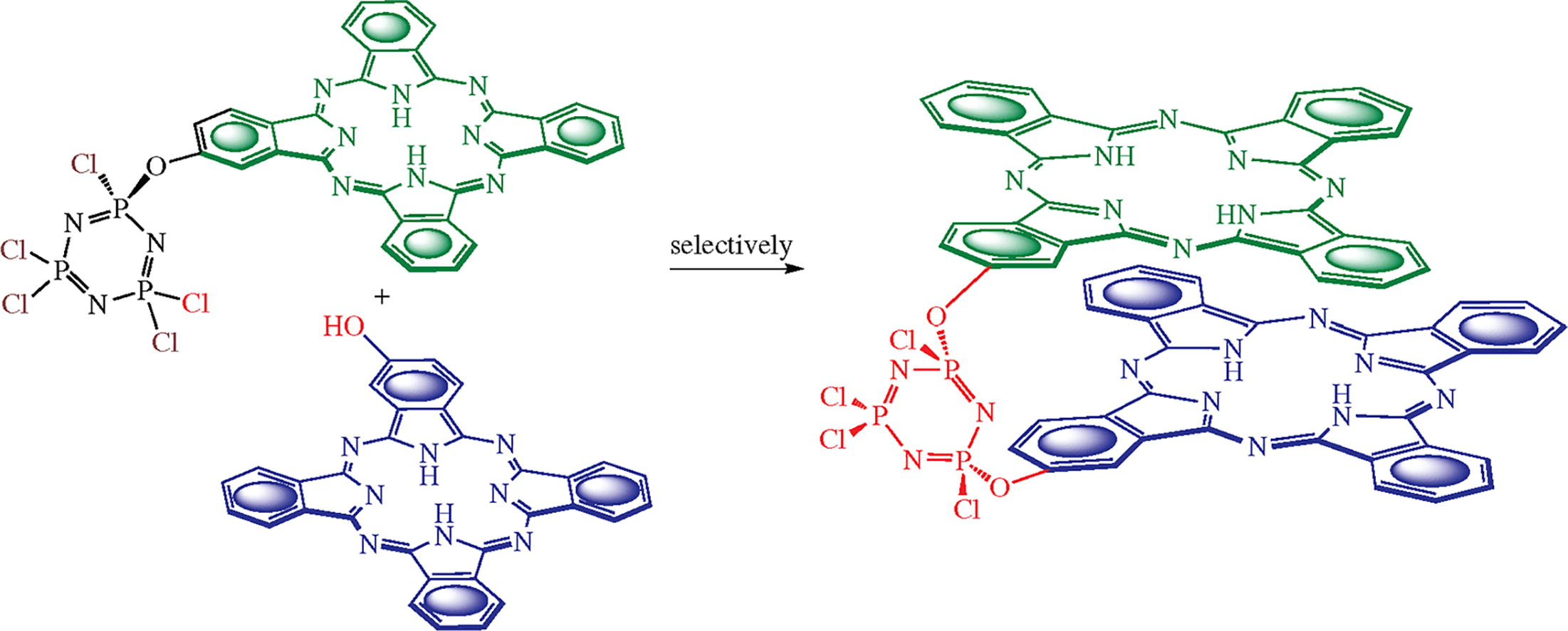 The selective synthesis of clamshell-type bis-phthalocyanine was performed using cyclotriphosphazene as a peripheral spacer. The spectral characteristics of the target dye are similar to those of most H-dimers, and the reaction can be considered conditionally selective with respect to the cis-isomer