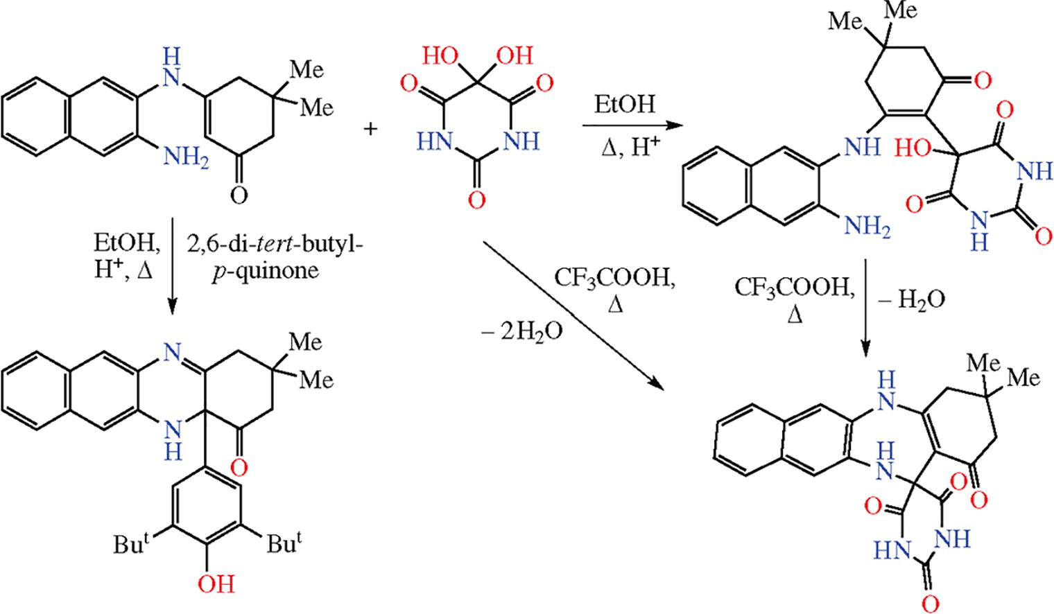 The reaction of 2,3-diaminonaphthalene with dimedone gave 3-[(3-amino-2-naphthyl)amino]-5,5-dimethylcyclohex-2-en-1-one that reacts with alloxan to afford a product of addition at the enamine moiety. The latter is converted to a spiro derivative on heating in CF3COOH, or undergoes condensation with 2,6-di-tert-butyl-p-benzoquinone to give a benzophenazinone derivative with a sterically hindered phenol substituent.