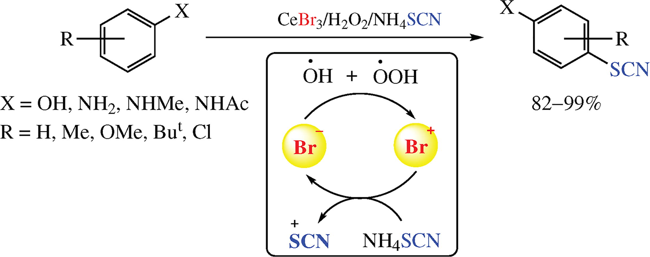 An efficient electrophilic thiocyanation of phenols and anilines in the CeBr3 / H2O2 system has been developed. The system CeBr3 / H2O2 generates reactive brominating species which would react with NH4SCN to deliver the active SCN cations in situ. The Br- anion can be further oxidized to Br+, thereby furnishing the catalytic cycle.