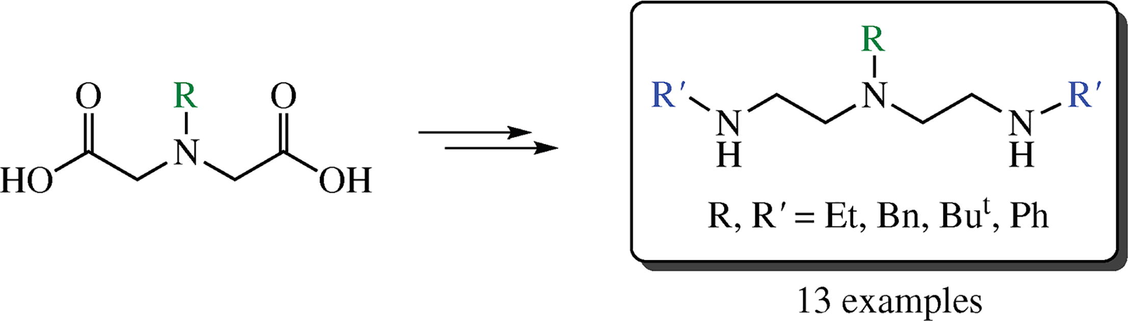 N,N',N''-Trisubstituted diethylenetriamines (1,4,7-triaza-heptanes) were synthesized by reduction of the relevantly substituted 2,2'-iminodiacetiamides which, in turn, were accessed from cheap reactants by the methods depending on their nature. The triamines thus obtained may be promising ligands for metal catalysts.