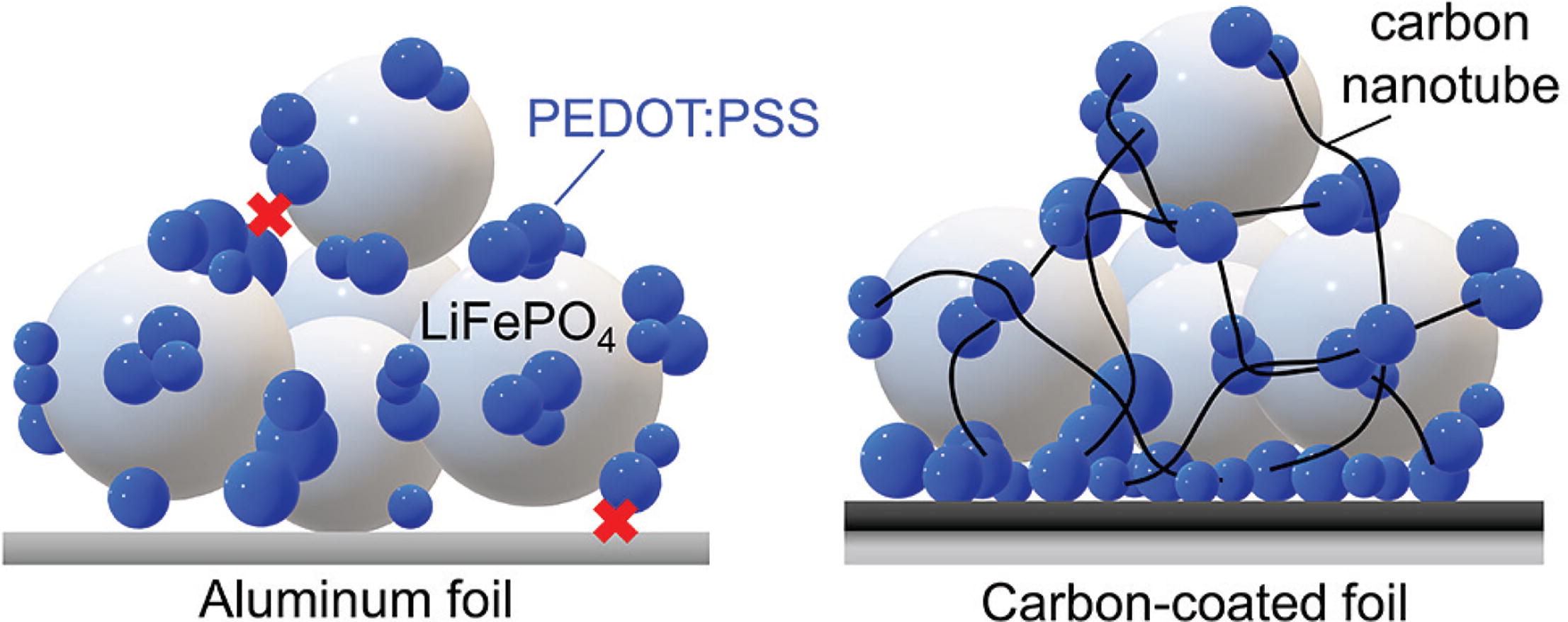 We report an approach for enhancing performance of PEDOT:PSS binder in Li-ion battery electrodes by introducing small amount of carbon additives. Coating of current collector with carbon increases adhesion and electrical contact to the binder while introduction of carbon nanotubes enhances the electrical contact between the binder particles. The combination of these factors improves rate and cycling capability of the electrode.