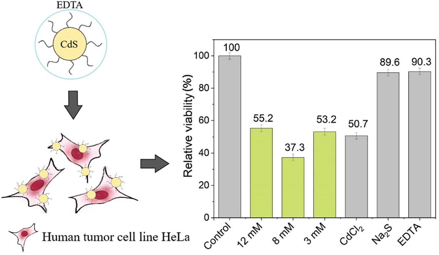 The properties and cytotoxicity of aqueous colloidal solutions of cadmium sulfide CdS nanoparticles obtained by chemical condensation were explored. Dynamic light scattering and optical spectroscopy were used to study the hydrodynamic diameter, size distribution, zeta-potential and optical properties of the CdS nanoparticles in solution. The cytotoxicity of colloidal CdS nanoparticles at different concentrations was assessed on cultures of human dermal fibroblasts and the cancer HeLa line.