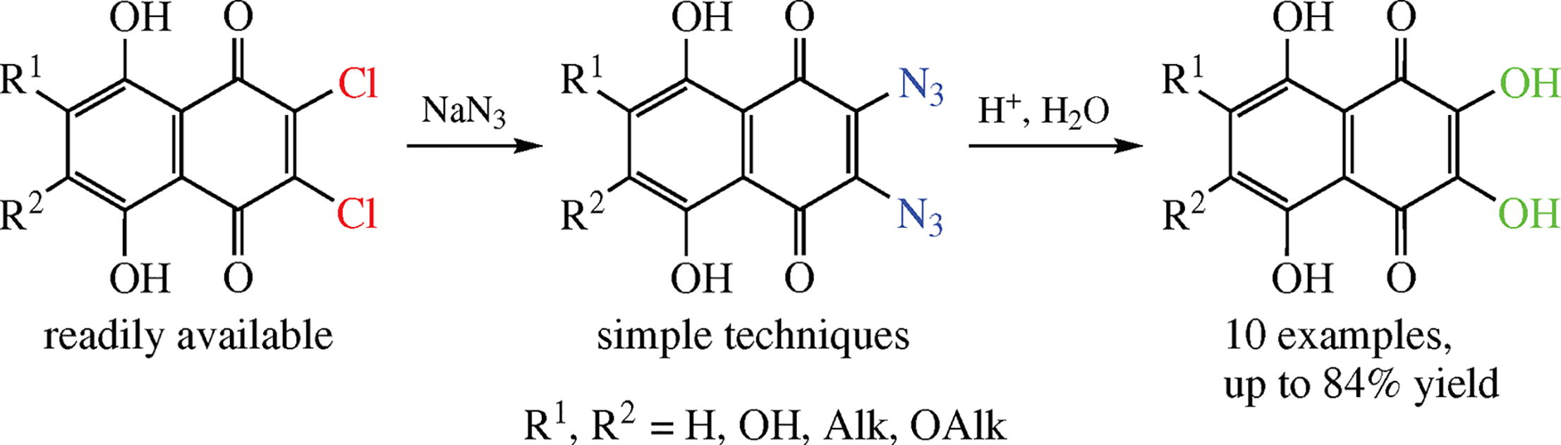 A short simple synthesis of spinazarins (2,3-dihydroxy-naphthazarins or 2,3,5,8-tetrahydroxy-1,4-naphtho-quinones) from available 2,3-dichloronaphthazarin derivatives involves replacement of chlorine atoms with azido groups followed by their acidic hydrolysis. The procedure can be used for the preparative synthesis of natural biologically active spinazarins and their analogues.