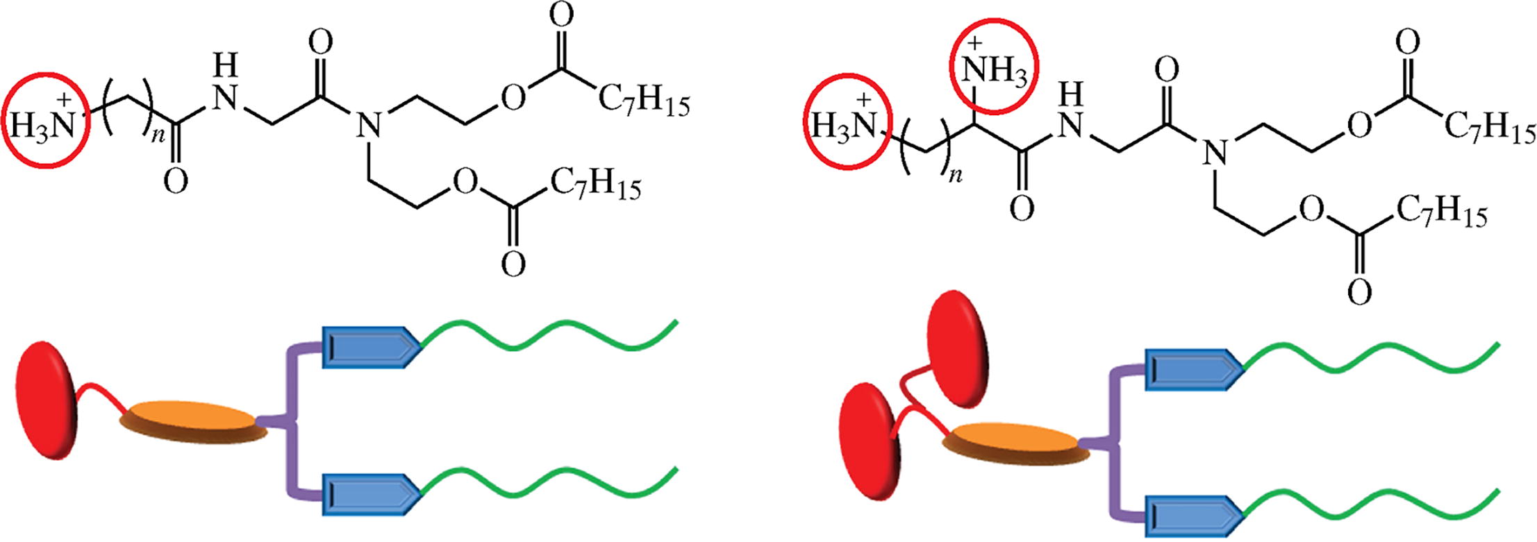 A series of new cationic amphiphiles based on diethanolamine esters with Gly, βAla, GABA, Lys, Orn amino acid residues in the hydrophilic block were prepared. The sample containing the Lys residue showed the best activity against gram-positive and gram-negative bacteria. For model membranes comprising combinations of DOPC, DOPG and DOPE phospholipids, the sample can electrostatically bind to the surface of a bacterial cell and destroy it by formation of through defects.