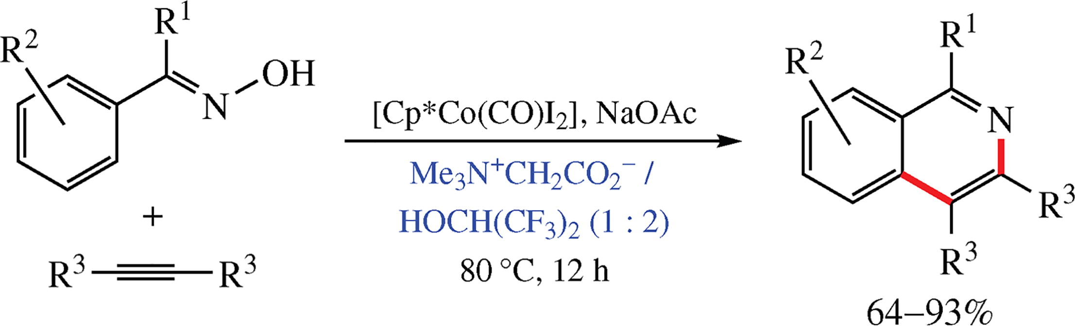 A cobalt-catalyzed redox-neutral [4 + 2] annulation of oximes and alkynes in deep eutectic solvents comprising quaternary ammonium compounds and hydrogen bond donors has been developed, the best system being Me3N+CH2CO2- / HOCH(CF3)2. No external oxidizing reagent was required, and only water was generated as the secondary product. The catalytic system can be reused in three consecutive cycles.