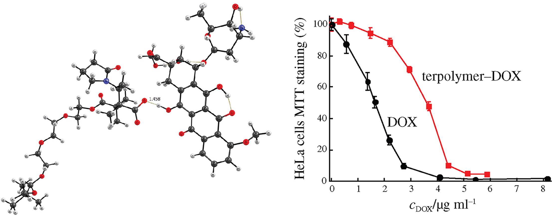 Compositions of doxorubicin with a terpolymer of N-vinylpyrrolidone, methacrylic acid and triethylene glycol dimethacrylate have been prepared and investigated by UV-VIS and NMR spectroscopy, cyclic voltammetry and DFT quantum chemical modeling. Oxygen containing groups of the terpolymer and hydrogen atoms of the drug OH and NH+ groups form hydrogen bonds. The compositions have lower cytotoxicity in vitro compared with that of free doxorubicin
