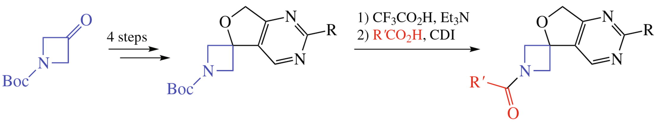 A novel spirocyclic scaffold of 7'H-spiro[azetidine-3,5'-furo[3,4-d]pyrimidine] chemotype was synthesized in N-Boc-protected form. However, the scaffold was revealed to be unstable to storage when deprotected. The solution was found in the brief removal of the Boc protecting group and rapid acylation of the liberated NH-azetidine with a carboxylic acid imidazolide.