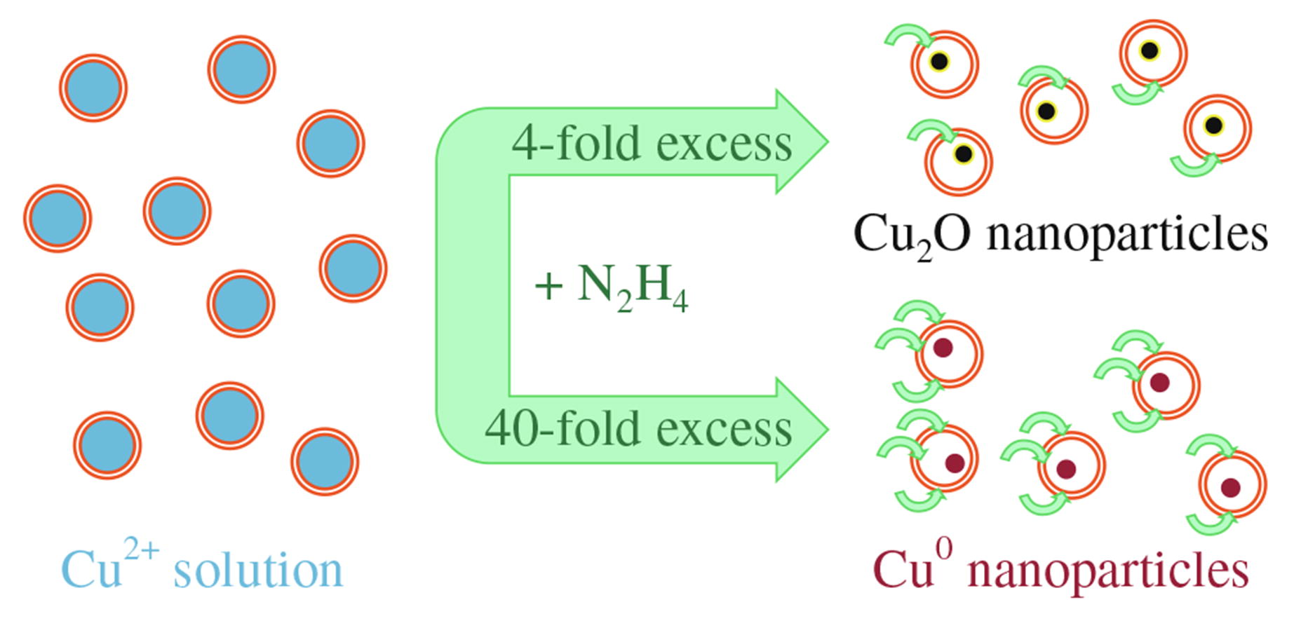 Copper nanoparticles 3.8 -10.9 nm in size were synthesized in solid-phase membrane liposomes by a facile method of copper sulfate reduction with hydrazine. A change in the excess of hydrazine leads to the controlled formation of either Cu2O or Cu0 nanoparticles.