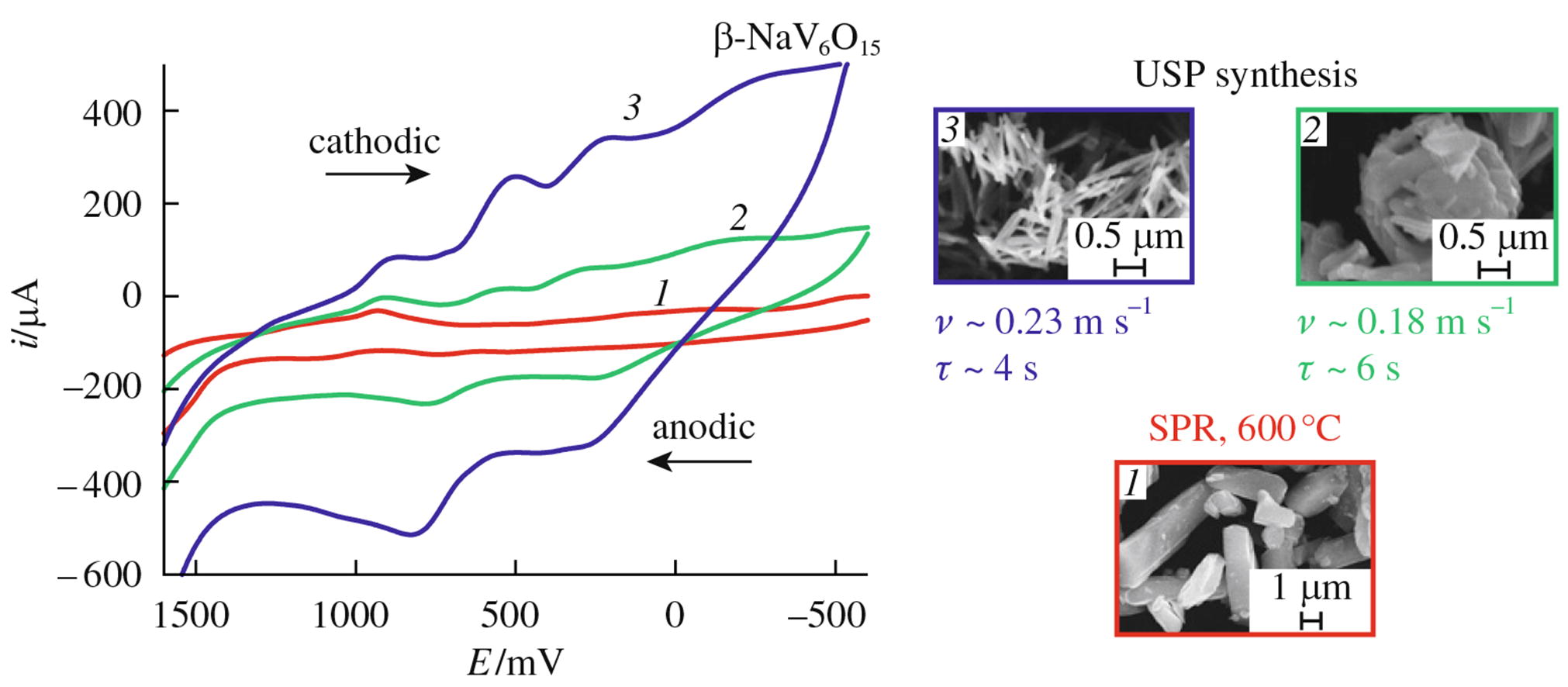 Current-voltage characteristics of nanostructured vanadium oxide bronze β-NaV6O15 obtained from oxalate solutions by ultrasonic spray pyrolysis (USP) under various conditions were studied. The conditions of USP synthesis significantly affected the particle morphology, specific surface area, defect structure and oxidizing ability of the compound.
