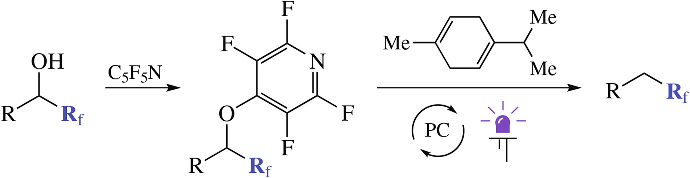 A new method for deoxygenation of fluoroalkyl-substituted alcohols involves derivatization of the hydroxy group with pentafluoropyridine followed by photoredox catalyzed reduction of the obtained hetaryl ethers using γ-terpinene as a source of hydrogen. The initial alcohols can be easily obtained by nucleophilic fluoroalkylation of the corresponding aldehydes.