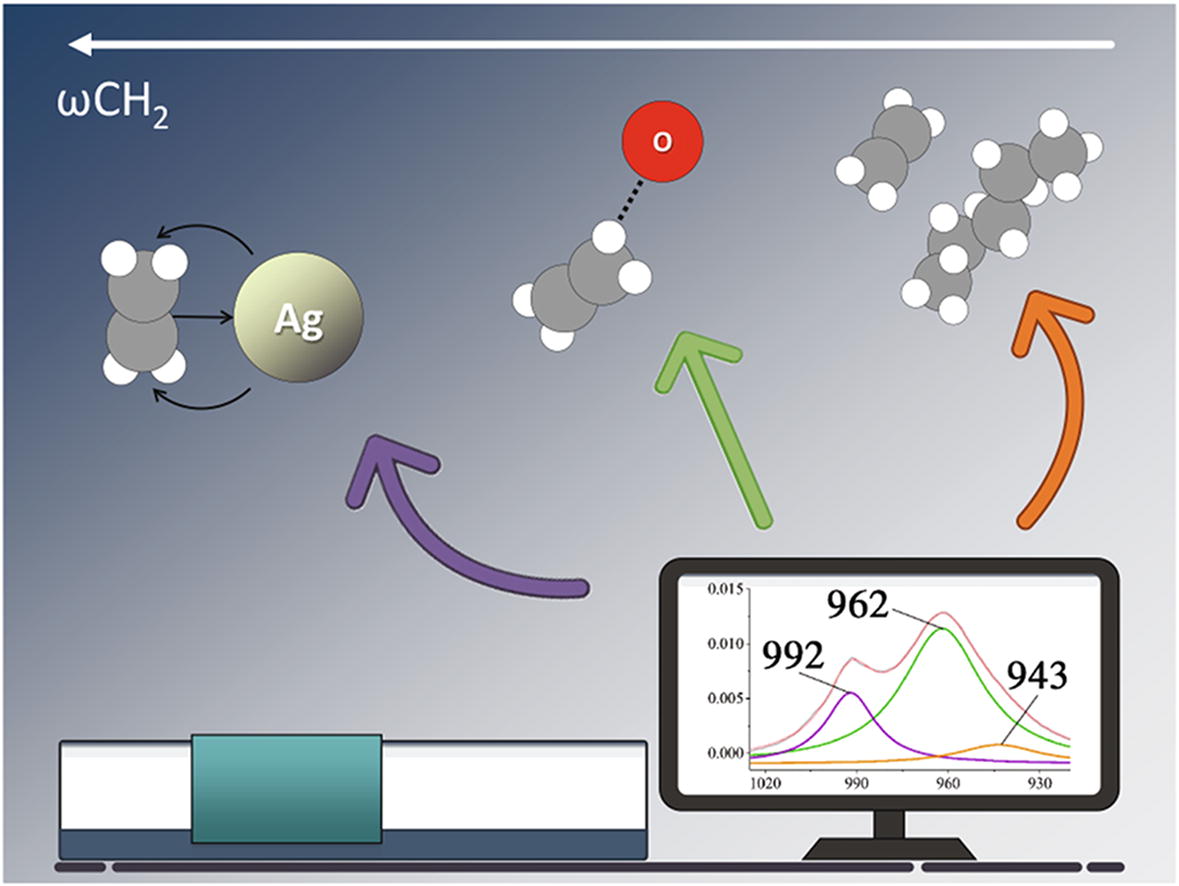 The spectral characteristics of ethylene absorbed by ionic liquids (ILs) containing silver ions were studied by in situ ATR-FTIR spectroscopy at high pressure. Three different states of ethylene were observed based on the band shift of out-of-plane bending vibrations (ωCH2) due to van der Waals interactions, hydrogen bonds, and π-complex formation with silver ions. Thus, ethylene can be used as an IR-sensitive probe molecule for characterizing interactions with ILs and other substances.