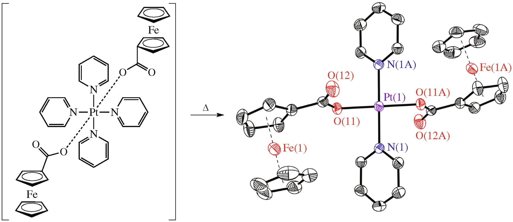 Novel square-planar Pt-based heterometallic complexes with ferrocenecarboxylic acid were prepared in two steps from (tetrapyridine)platinum diacetate [PtPy4](OAc)2. The crystal structure of [PtPy4](FcCOO)2 and [PtPy2(FcCOO)2] was established by single crystal X-ray diffraction. Subsequent thermal transformation of a trinuclear compound [PtPy2(FcCOO)2] to a bimetallic Pt-Fe phase was studied by XAFS techniques.