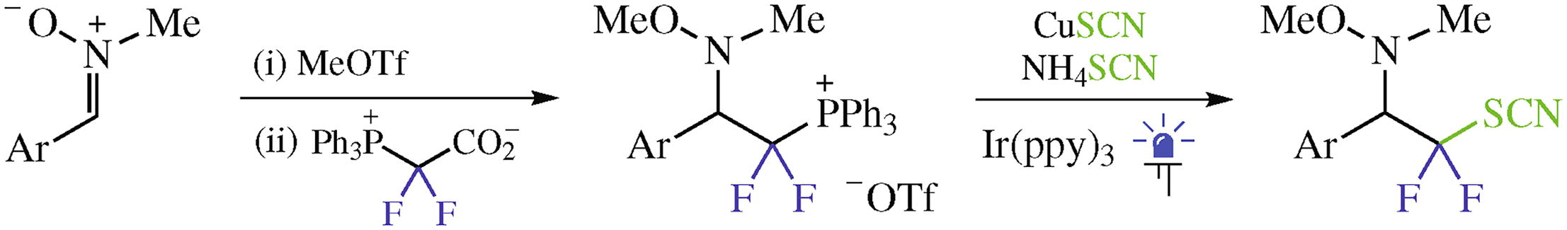 gem-Difluorinated phosphonium salts were generated from nitrones by methylation and reaction with (triphenylphosphonio)difluoroacetate. The phosphonium salts were subjected to visible light-induced phosphonium-thiocyanate exchange in the presence of ammonium thiocyanate, copper thiocyanate, and an iridium photocatalyst. The sequence of the reactions was performed in one pot affording thiocyanates attached to the difluoromethylene fragment.