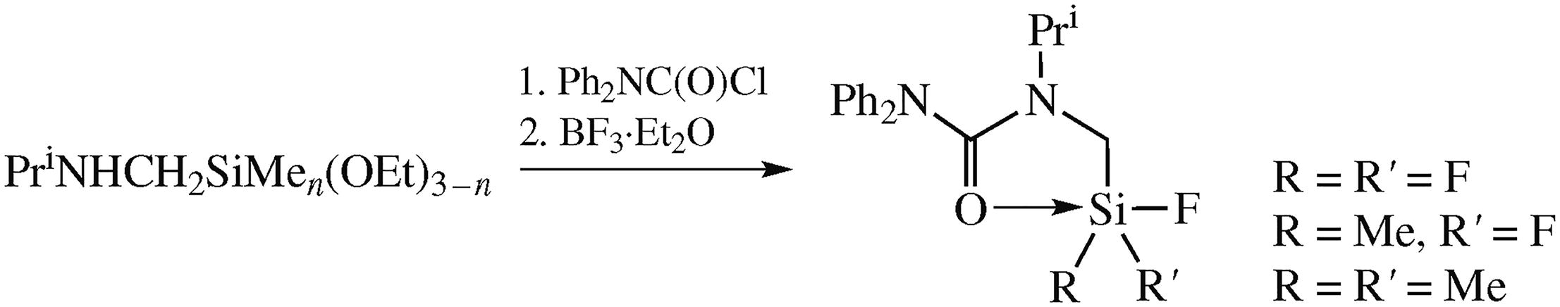 New N-isopropyl-N',N'-diphenyl-N-(silylmethyl)ureas were obtained, and their structure was explored by 1H, 13C, 29Si NMR spectroscopy and X-ray analysis. These results have shown that N-isopropyl-N', N'-diphenyl-N-[(fluorosilyl)-methyl]ureas exist as (O-Si) chelates with intramolecular dative bond C=O→Si.