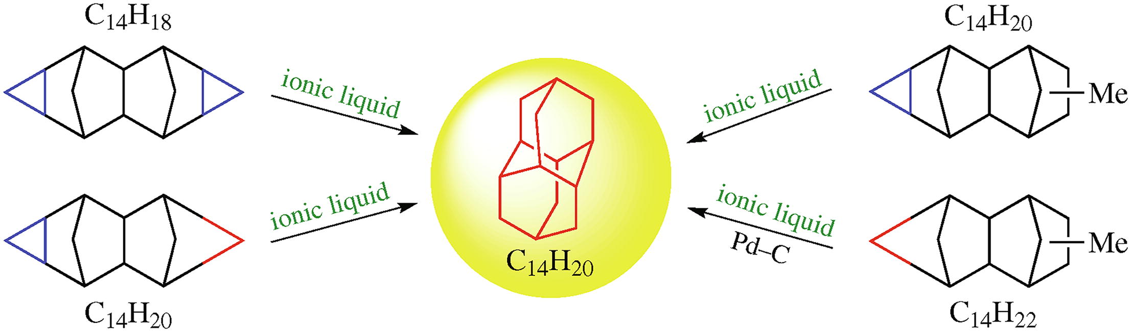 Diamantane was obtained by skeletal rearrangement of three new polycyclic hydrocarbons C14H18, C14H20 and C14H22 under the action of aluminate ionic liquids. For the successful isomerization of hydrocarbon C14H22 containing two hydrogen atoms more, the addition of Pd/C to the reaction medium is necessary.