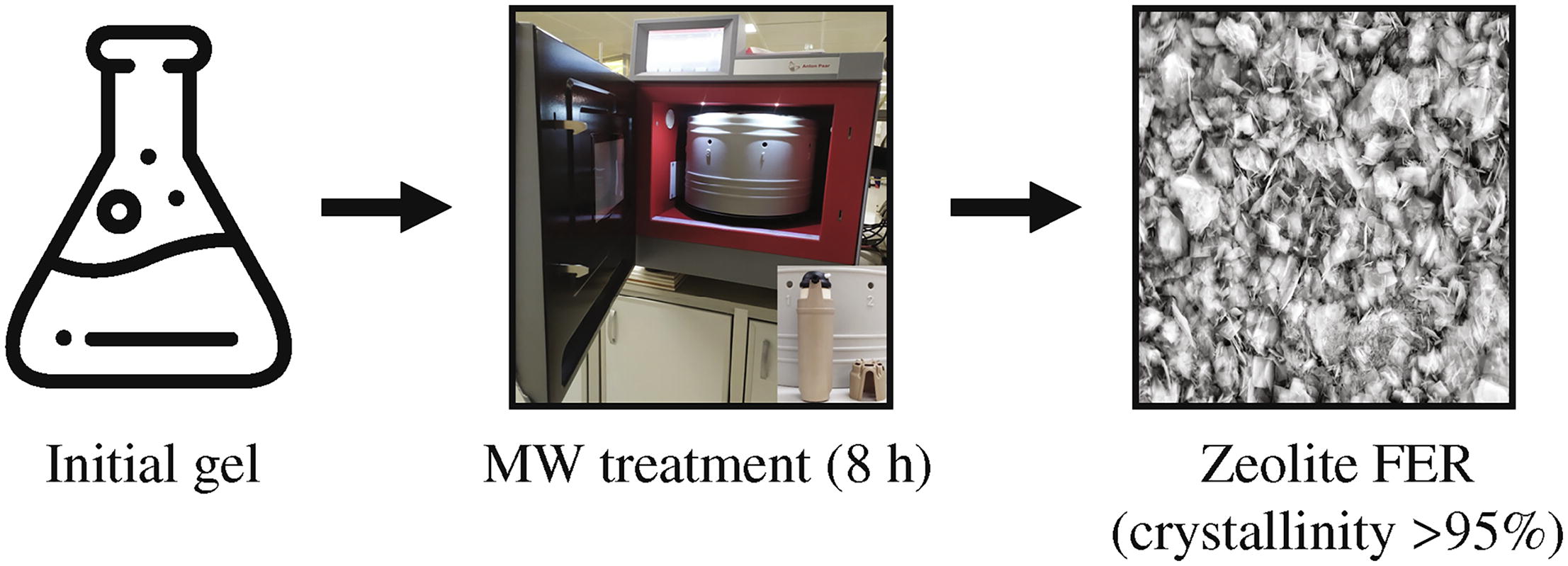 A new method for the synthesis of ferrierite-type zeolite has been developed using microwave irradiation in the presence of structure-directing agents (templates). The physicochemical characteristics of the synthesized zeolites were investigated by X-ray diffraction analysis, low-temperature nitrogen adsorption-desorption and SEM-EDX. When comparing the synthesis products, it was found that microwave irradiation significantly reduces the crystallization time of the synthesized zeolites compared to traditional hydrothermal treatment