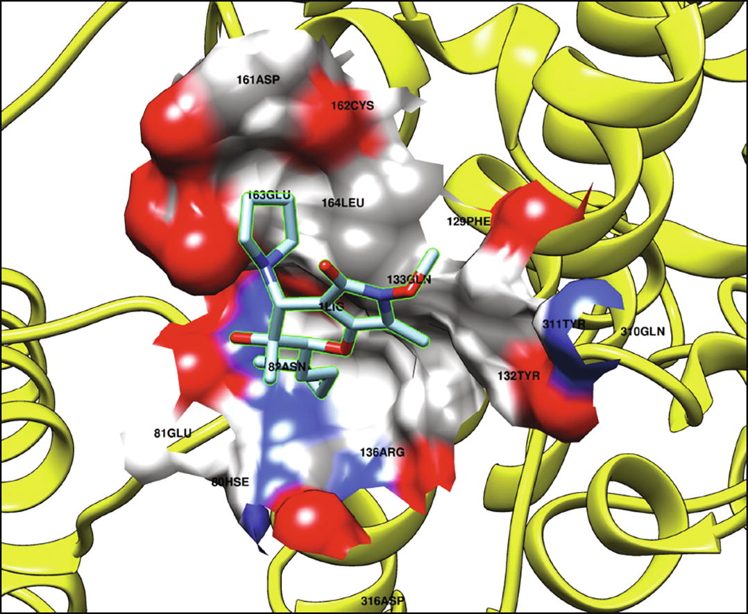 The structure of the lead compound, a natural phaeospha- eride A derivative AV-6, (2S,3R,4R)-3-hydroxy-6-methoxy-3-methyl-7-methylene-2-pentyl-4-pyrrolidin-1-yl-3,4,6,7-tetrahydropyrano[2,3-c]pyrrol-5(2H)-one, was unambiguously determined by X-ray crystallography. When modeling in silico the interaction of AV-6 with targets in kinase cascades, high values of the binding energy (below -9 kcal mol-1) for some protein targets were shown. Our results identified that MAPK11, MAPK12 and AKT1 could be targets of AV-6.