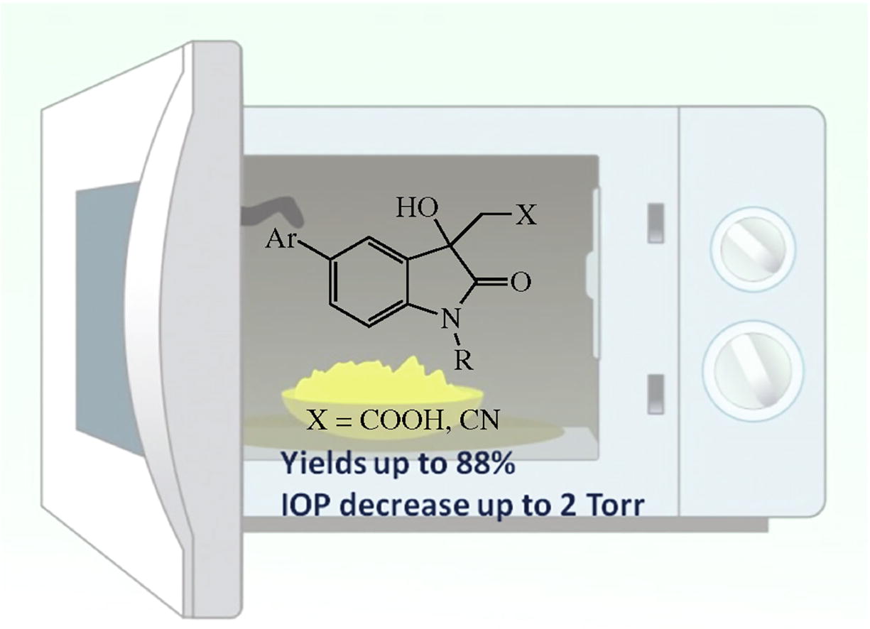 A set of new 5-aryl-3-hydroxy-2-oxindoles was synthesized by decarboxylative condensation of the corresponding 5-aryl-substituted isatins with malonic or cyanoacetic acids under microwave irradiation. The antiglaucomic activity of the obtained compounds was evaluated. The most water soluble compounds can reduce the intraocular pressure (IOP) up to 2 Torr.