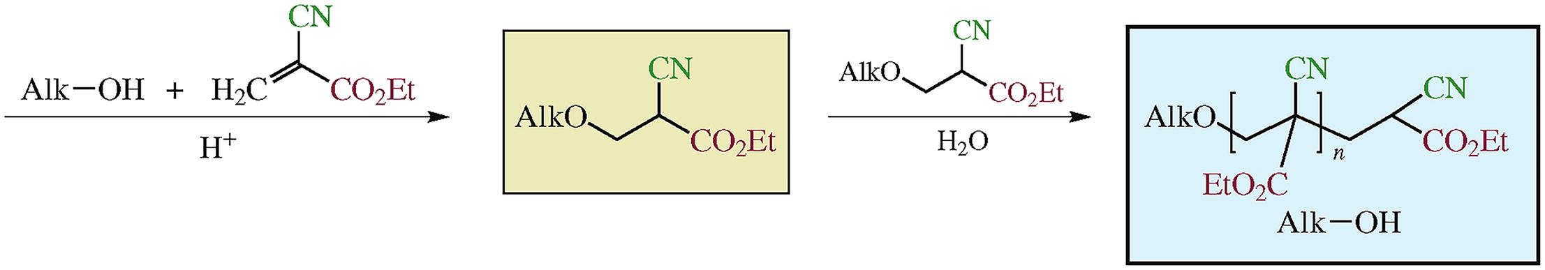 Ethyl 3-alkoxy-2-cyanopropanoates were prepared by the reaction of ethyl 2-cyanoacrylate with the corresponding linear alkanols C6-C12 in acidic medium. Their treatment with water as a weak nucleophile resulted in elimination of the alkanol and the formation of oligocyanoacrylate terminated with the alkoxy group. The oligomers were studied by NMR spectroscopy, IR spectroscopy, MALDI-TOF mass-spectrometry and dynamic light scattering.