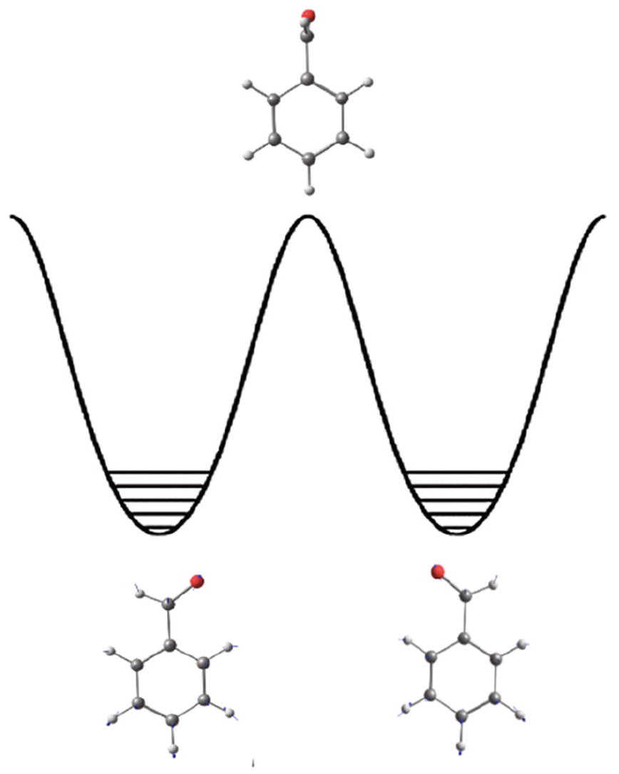 The ratio of potential barrier heights for the internal rotation of benzaldehyde molecule calculated by quantum mechanical methods and determined experimentally from UV spectra has been discussed. Based on the joint analysis of the results of ab initio MP2/6-311G** calculations of normal vibrations of benzaldehyde in the ground state and the results of interpretation of the observed UV spectra of the compound, possible approximations for a correct description of the hindered internal rotation of the aldehyde group have been considered. The two-dimensional model including the kinematic interaction between torsion and out-of-plane deformation of aldehyde group has been established as more efficient for the correct description of the hindered rotation in benzaldehyde.