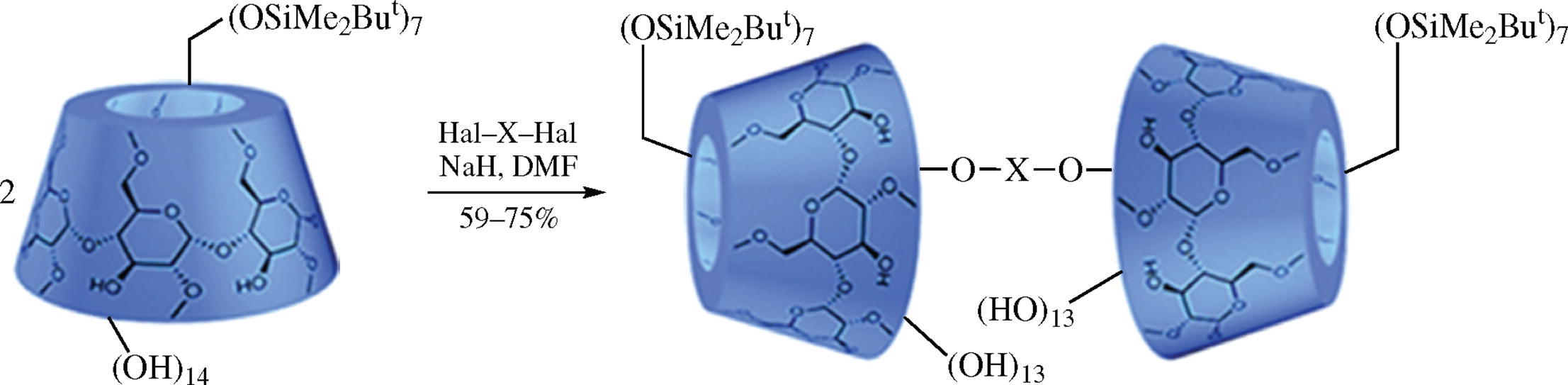 The simple synthesis of cyclodextrin dimers connected with linkers through the secondary hydroxy groups involves TBS protection of the primary hydroxy groups followed by linking with α,ω,-dihalo aliphatic compounds. The dimers thus obtained may be of interest as molecular hosts in pharmaceutics, cosmetics and biomedicine.