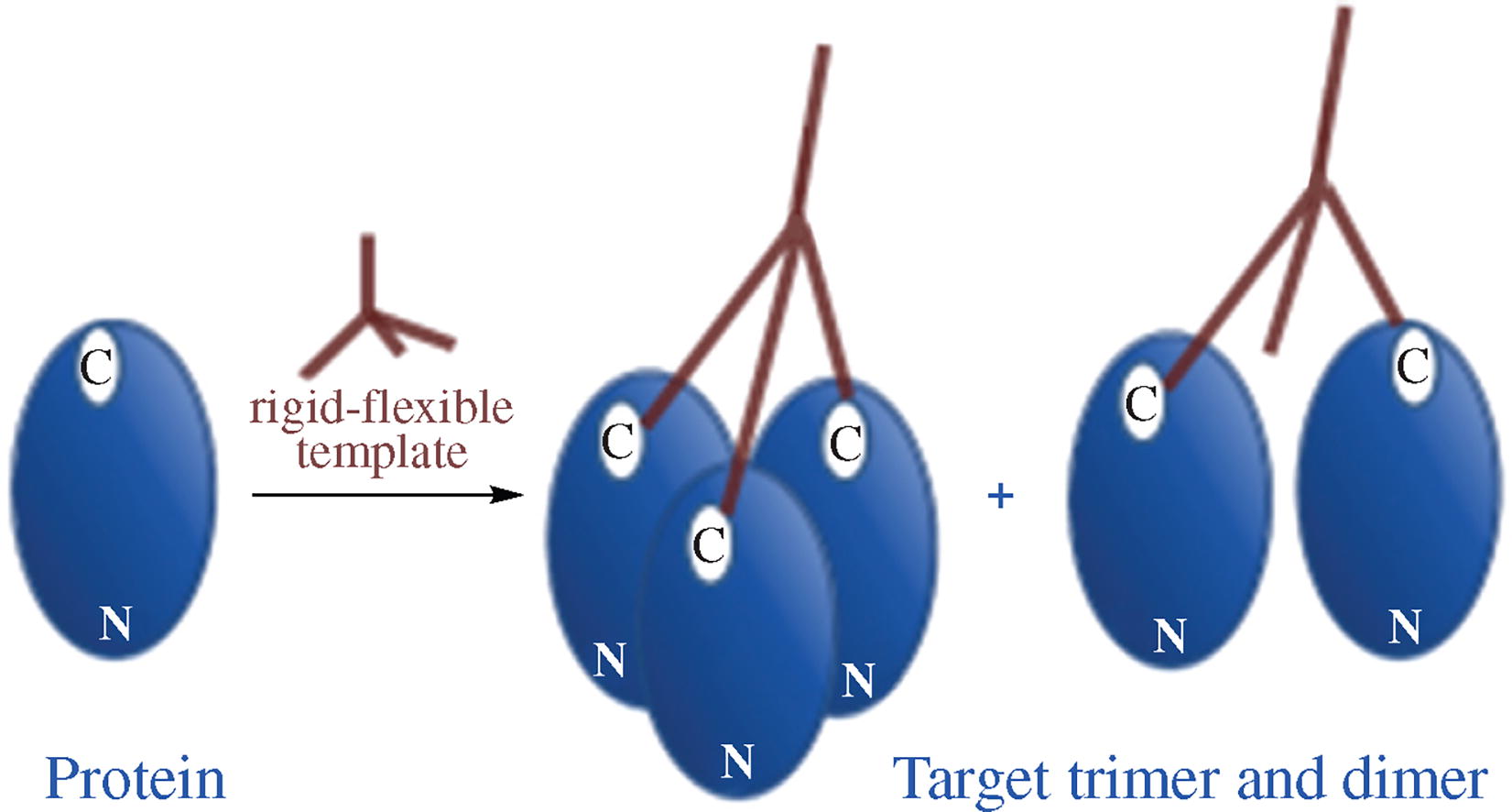 We demonstrated covalent cross-linking of two or three protein molecules specifically at the C-terminus by sortase-catalyzed conjugation of recombinant proteins with conformationally rigid-flexible tetraantennary templates, where structure of the antenna is [Gly-Gly-(N-CH2COOH)Gly]nCH2-.