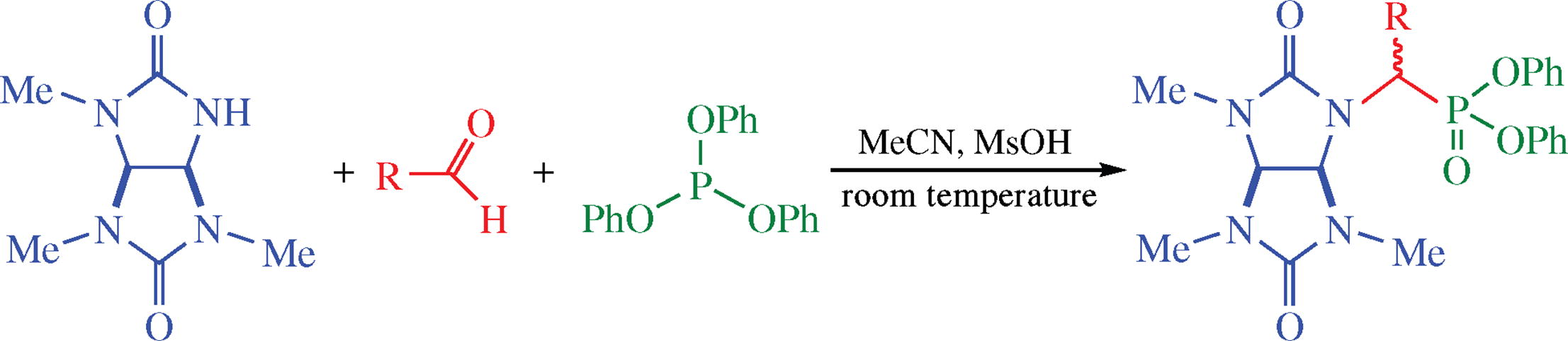 The reaction of 1,3,4-trimethylglycoluril, aliphatic aldehydes and triphenyl phosphite in the presence of methanesulfonic acid affords new phosphorus-containing derivatives of glycoluril. The thus formed diastereomers of 1-[1-(diphenoxy-phosphoryl)alkyl]-3,4,6-trimethylglycolurils were separated by reverse-phase HPLC