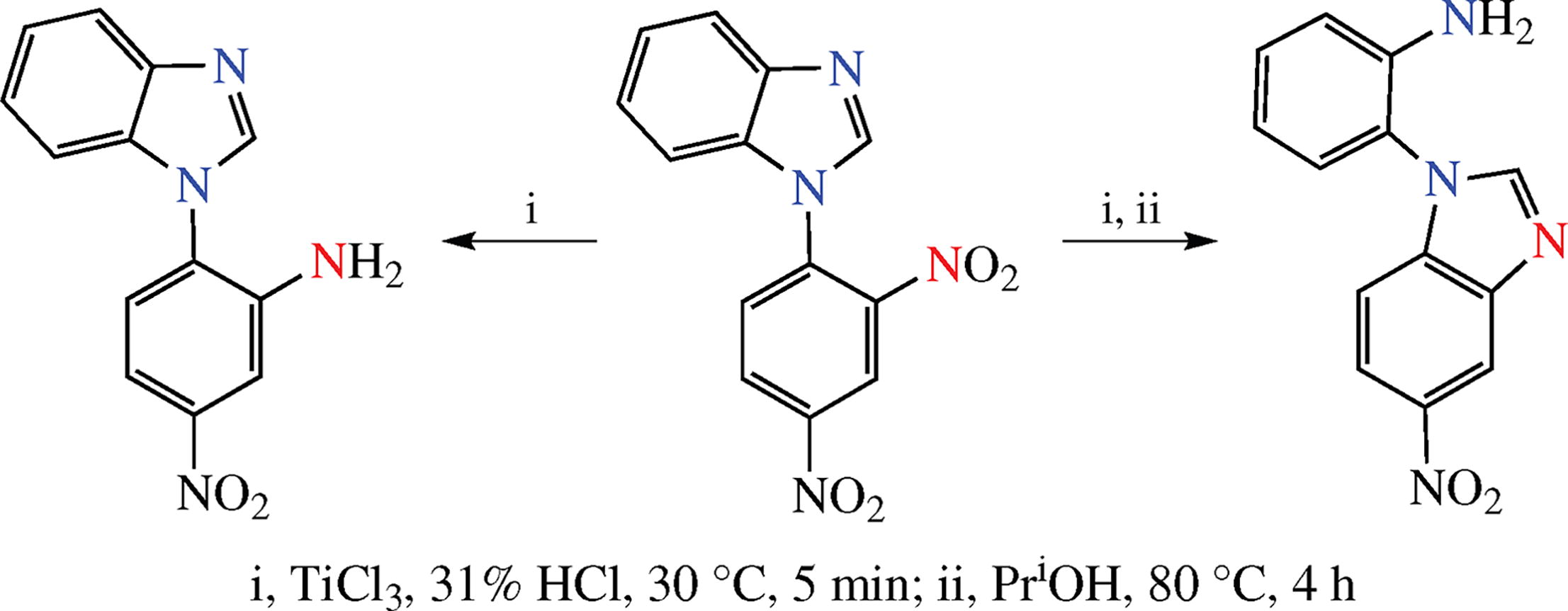 The efficiency of two strategies for the synthesis of N-(2-aminophenyl)-5-nitrobenzimidazole derivatives was studied. The promising route involves the stages of 1-(2,4-dinitro-phenyl)-1H-benzimidazole monoreduction at 2-positioned nitro group and tandem conversion involving recyclization of the intermediate N-(2-amino-4-nitrophenyl)-5-nitrobenz-imidazole.