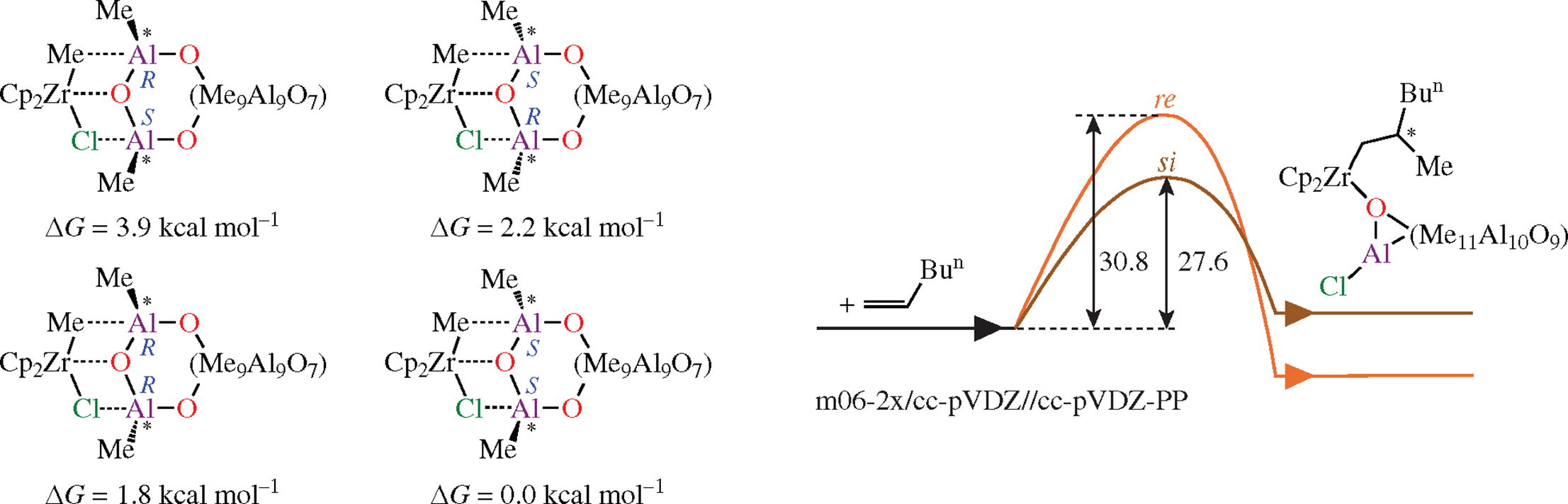 Quantum chemical modeling of the mechanism of asymmetric induction in the course of alkene (propene, hex-1-ene) coordination with Cp2ZrMe(Cl)-methyl-alumoxane stereoisomeric complexes, which could act as catalytically active centers of the alkene oligomerization and polymerization, was carried out. A significant influence of the relative configuration of the chiral centers at the Al atoms of the activator on the parameters of the alkene insertion into Zr-C bond of the complexes was shown.