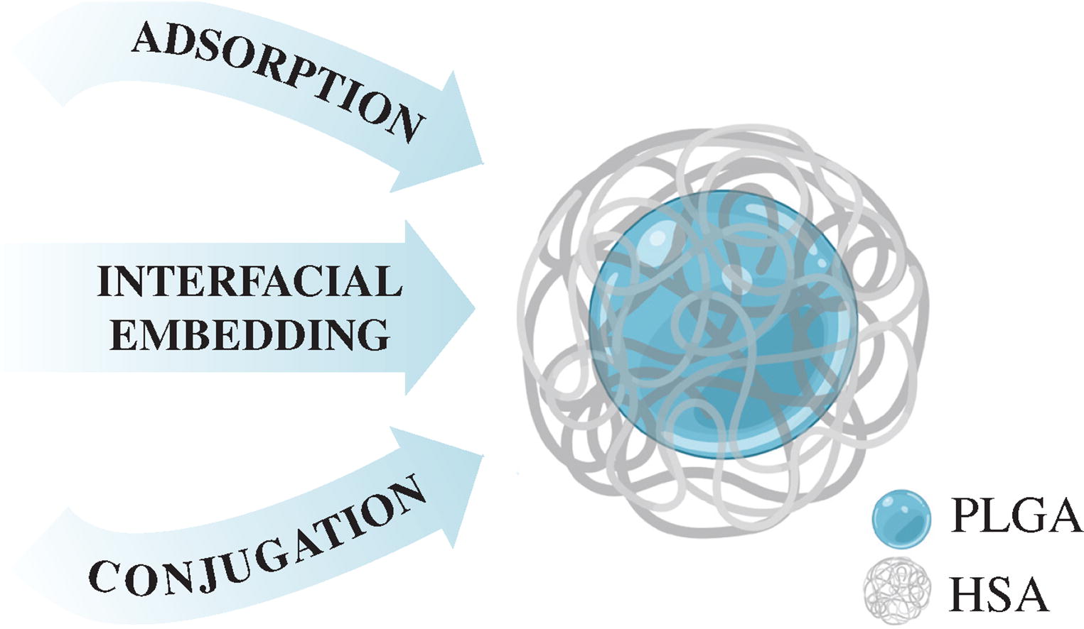 Core-shell nanoparticles with poly(lactide-co-glycolide) cores and human serum albumin shells (PLGA/HSA NPs) were prepared by three methods: by interfacial embedding of HSA in the PLGA NP surface during their formation and by adsorption or conjugation of HSA on pre-prepared PLGA NPs. All methods yielded PLGA/HSA NPs with a size of 130-150 nm and a narrow size distribution. In vitro fluorescence microscopy revealed the integrity of all core-shell systems when internalized in GL261 cells.