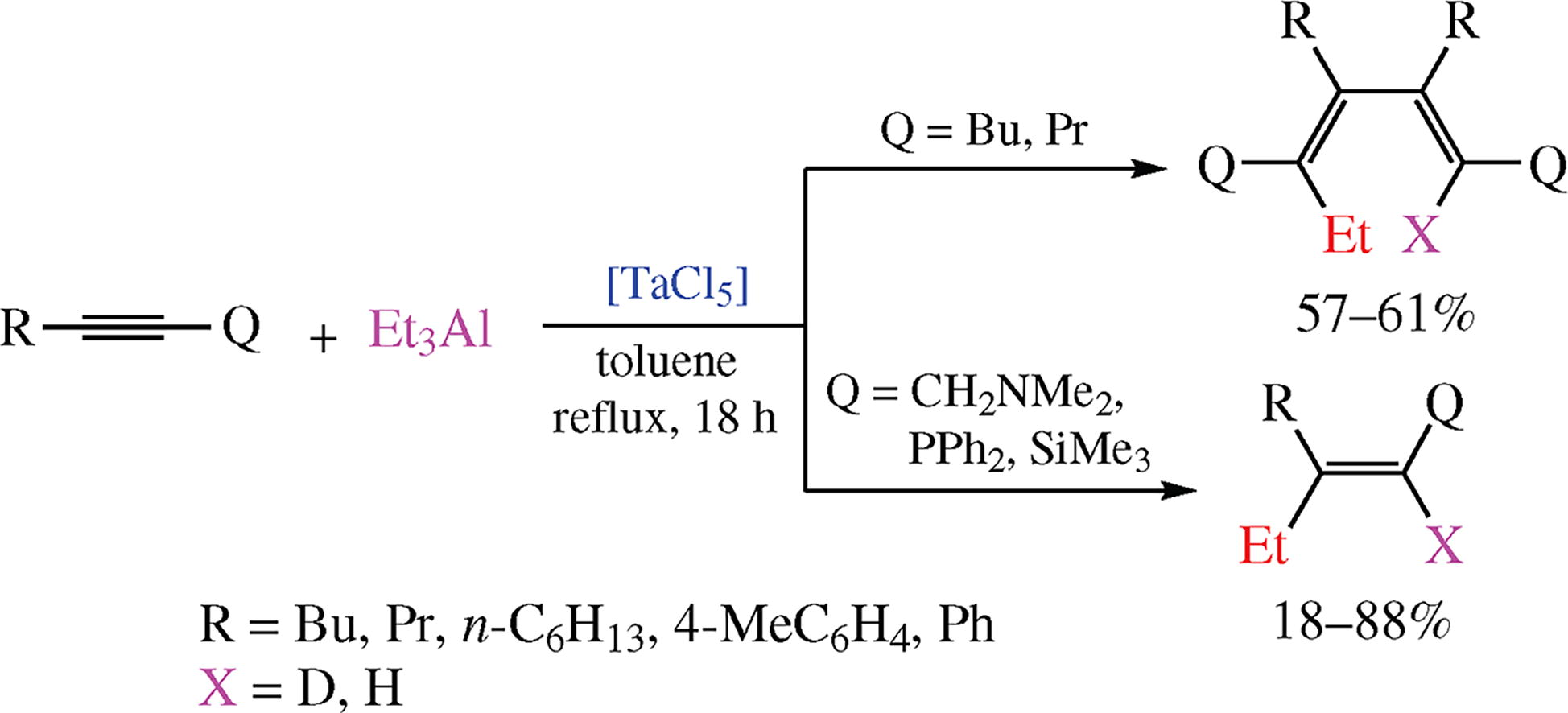 Tantalum pentachloride-catalyzed reaction of 1,2-dialkyl-acetylenes with Et3Al affords regio- and stereoselectively tetraalkyl-substituted (Z,E)-hexa-1,3-dienes and (Z)-tri-substituted olefins in a ratio of 2 : 1. In cases of 1-alkynylphosphines, 1-alkynylsilanes and 2-alkynylamines, the corresponding functionalized monoolefins are formed.