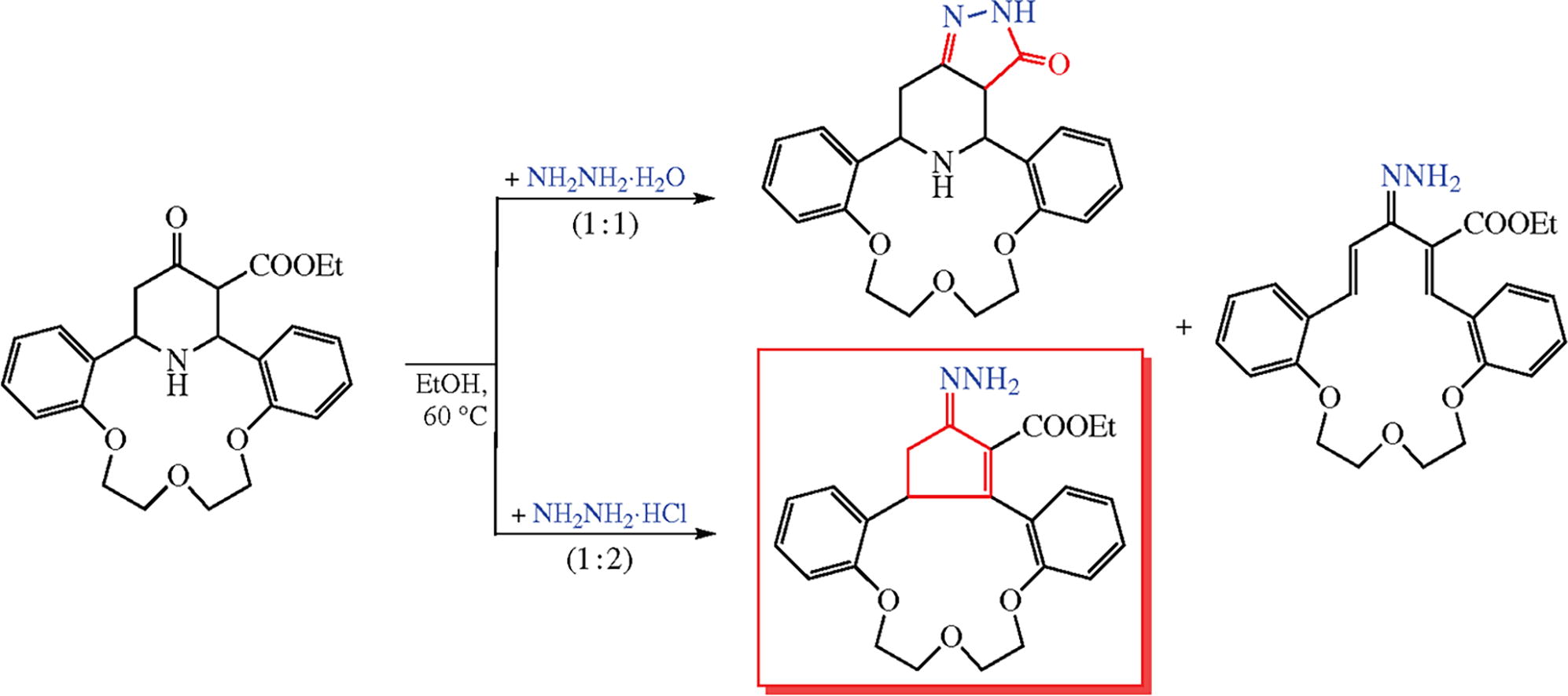 Reactions of aza-14-crown-4 incorporating 4-oxopiperidine-3-carboxylate moiety with hydrazine and hydroxylamine proceed at the functional groups. One unexpected product, cyclopenteno-13-crown-3 ether derivative, is formed when hydrazine hydrochloride is used, its formation occurring via deamination of the piperidine followed by the Nazarov reaction of the intermediate hydrazono diene. According to the QSAR through ADMET calculation, the synthesized compounds may show high potential for biological studies.