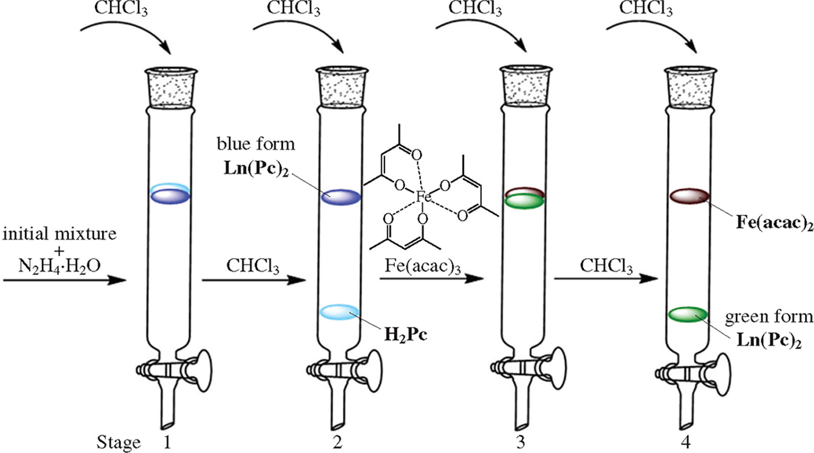 During the synthesis of double-decker f-metal phthalocyanine complexes Ln(Pc)2 free phthalocyanine ligands can be also formed, however, routine column chromatography is not effective for their separation. The preliminary reduction of the complexes with hydrazine hydrate affords the low mobile forms, which can be re-oxidized in the chromatography columns after the free ligand is eluted.