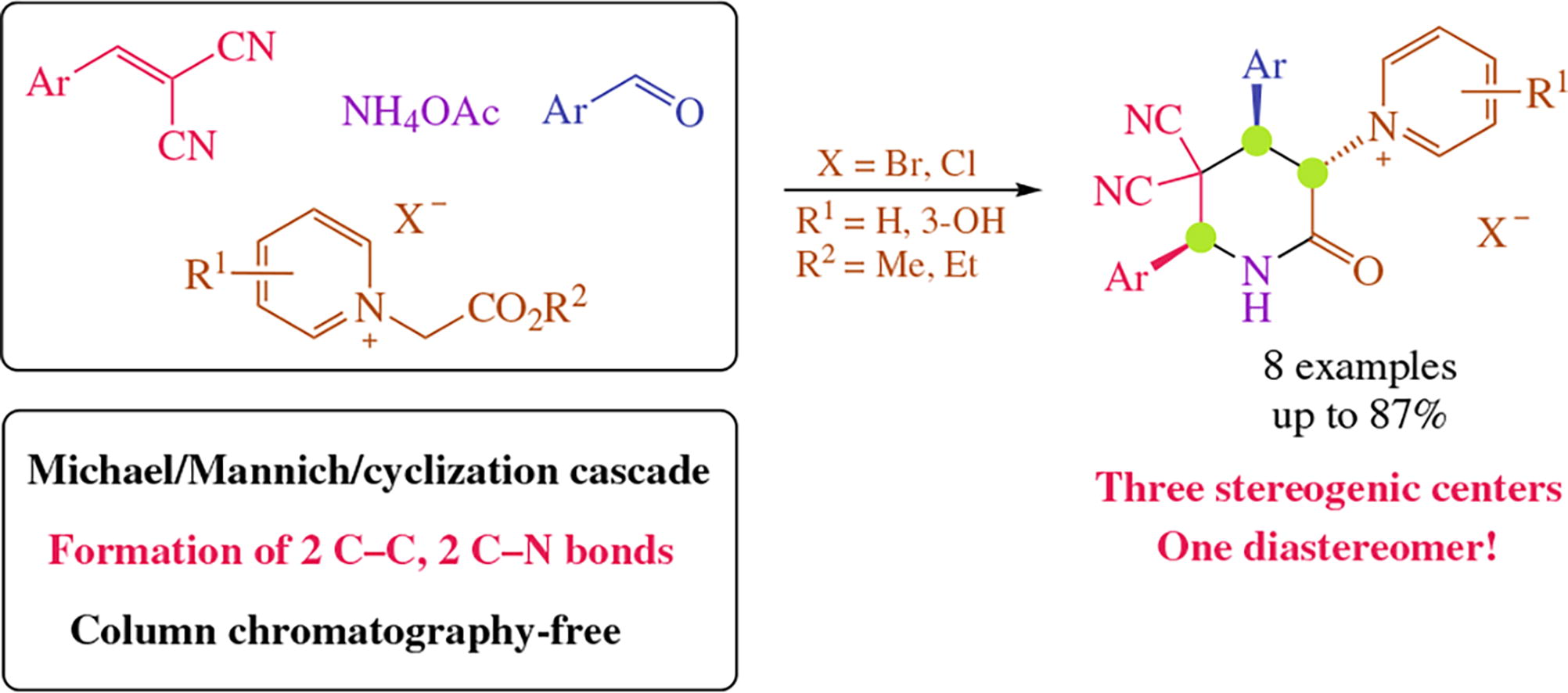 The Michael-Mannich-cyclization cascade of dicyano olefins, 1-(2-alkoxy-2-oxoethyl)pyridin-1-ium halogenides, aromatic aldehydes and ammonium acetate provides convenient stereoselective formation of (4,6-diaryl-5,5-dicyano-2-oxo-piperidin-3-yl)pyridin-1-ium halogenides with three stereogenic centres. Ammonium acetate plays dual role acting as a base and as a nitrogen source.