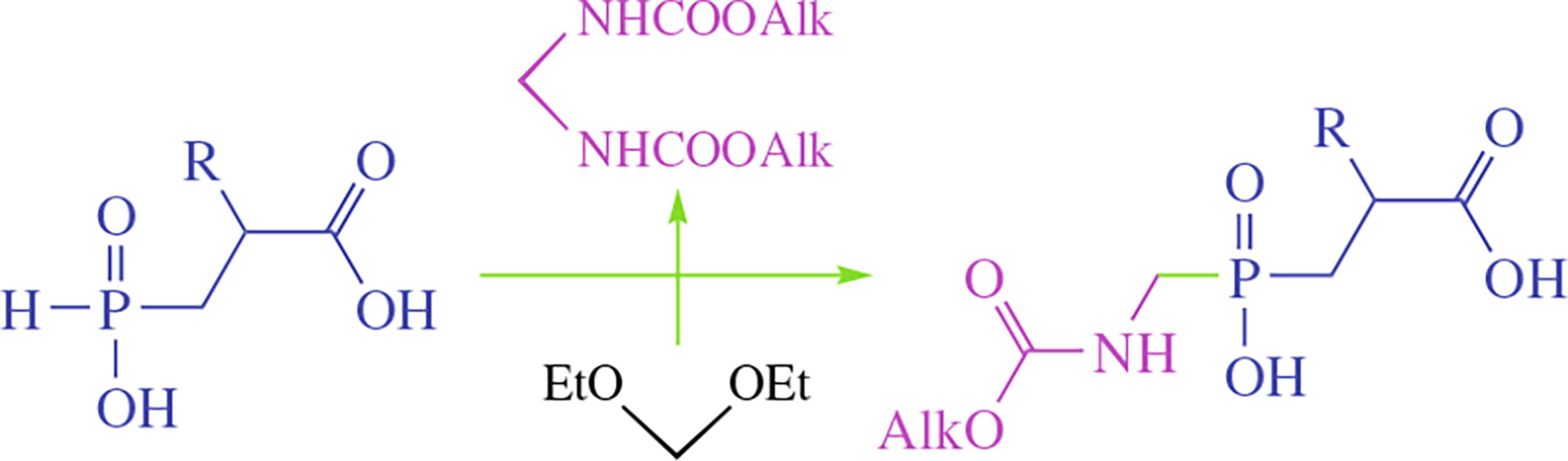 The reaction between dialkyl methylenebiscarbamates and phosphonous carboxylic acids affords N-protected phosphinic pseudopeptides incorporating glycine isostere. The compounds obtained are promising building blocks for subsequent peptide modification.