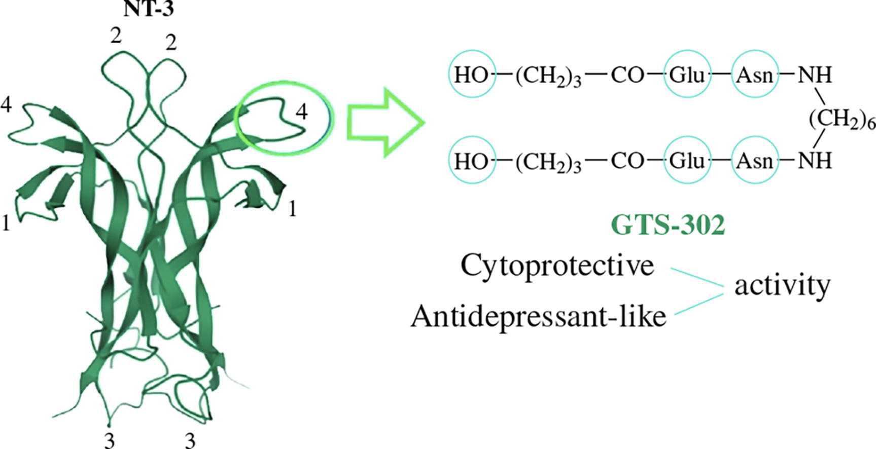 A novel neurotrophin-3 loop 4 dipeptide mimetic, bis(N-γ-hydroxybutyryl-L-glutamyl-L-asparagine) hexamethylenedi-amide (GTS-302), was designed and synthesized. Compound GTS-302 activated the tyrosine kinase receptors TrkC and TrkB, exhibited cytoprotective activity (10-8-10-5 M) in oxidative stress model in HT-22 cells and in 6-hydroxy-dopamine-induced SH-SY5Y cell damage. It also demon- strated an antidepressant-like activity in the forced swim test in mice (0.5-10.0 mg kg-1, intraperitoneally).