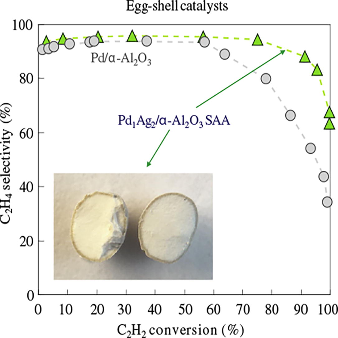 The PdAg/α-Al2O3 catalyst with an egg-shell distribution of single-atom alloy (SAA) Pd1Ag nanoparticles was obtained using the complex PdAg2(OAc)4(HOAc)4 as a precursor and characterized by FESEM-EDS, XPS, and DRIFTS CO analysis. The egg-shell Pd1Ag SAA catalyst demonstrated superior selectivity in the hydrogenation of acetylene in acetylene-ethylene feed.