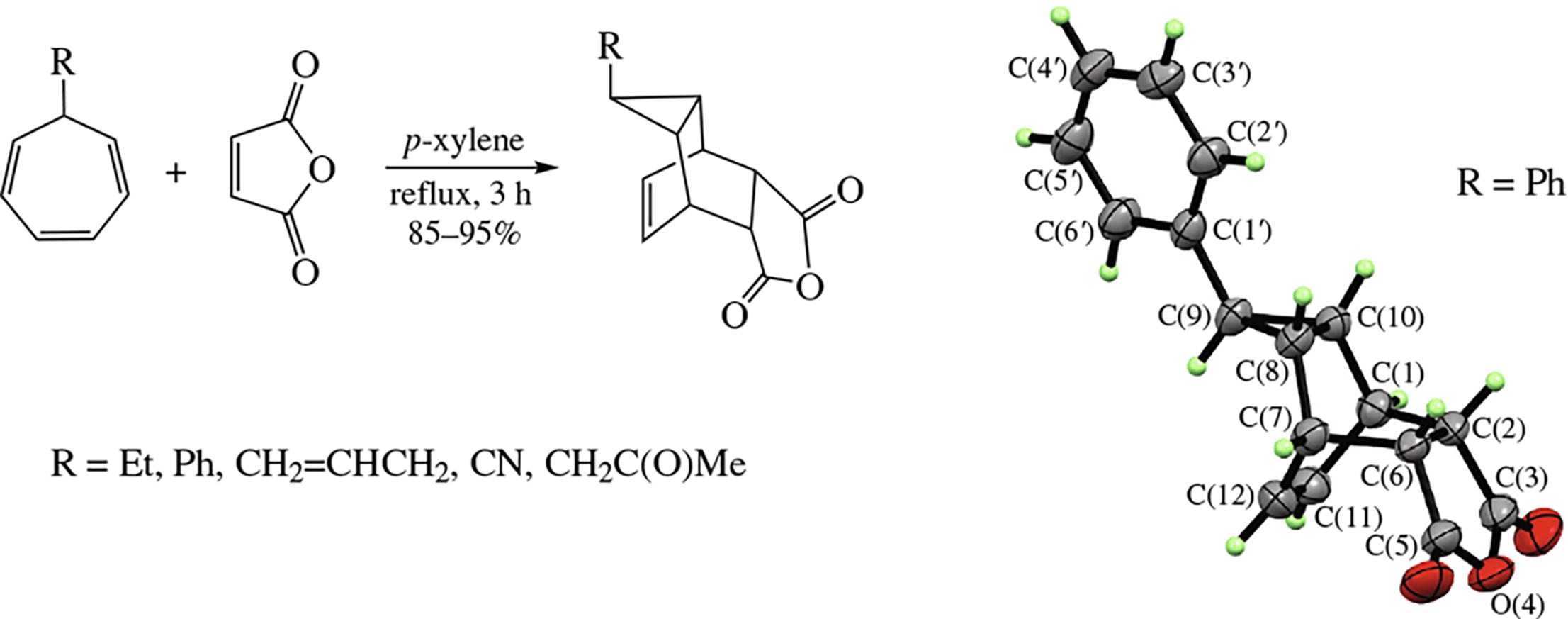 The [4+2]-cycloaddition of maleic anhydride to 7-substituted 1,3,5-cycloheptatrienes involves their 7-R-bicyclo[4.1.0]-hepta-2,4-diene tautomers and affords new 4-oxatetra- cyclo[5.3.2.02,6.08,10]dodec-11-ene-3,5-diones in 85-95% yields. The structure of the resulting adducts is proved using advanced 1D and 2D NMR techniques and X-ray diffraction analysis. The cycloaddition proceeds stereo specifically providing meso-(1S*,2S*,6R*,7R*,8R*,9-anti,10S*)-configuration in the products